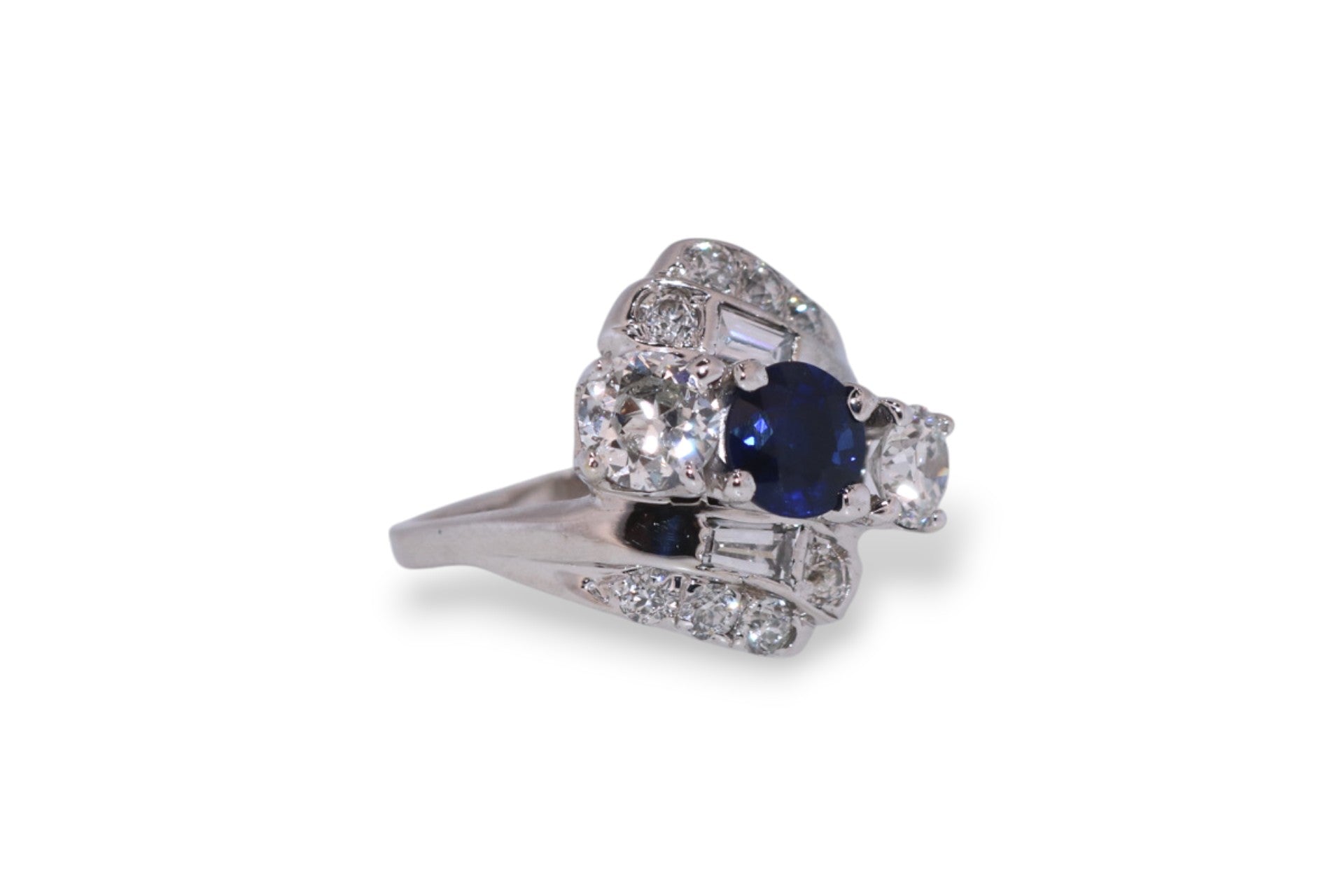 This vintage estate ring features a 1.07 carat blue sapphire accented by 1.00 carat total weight of sparkling diamonds, all set in solid 14K white gold. The bold combination of rich sapphire color and diamond brilliance gives this piece a timeless, elegant presence.