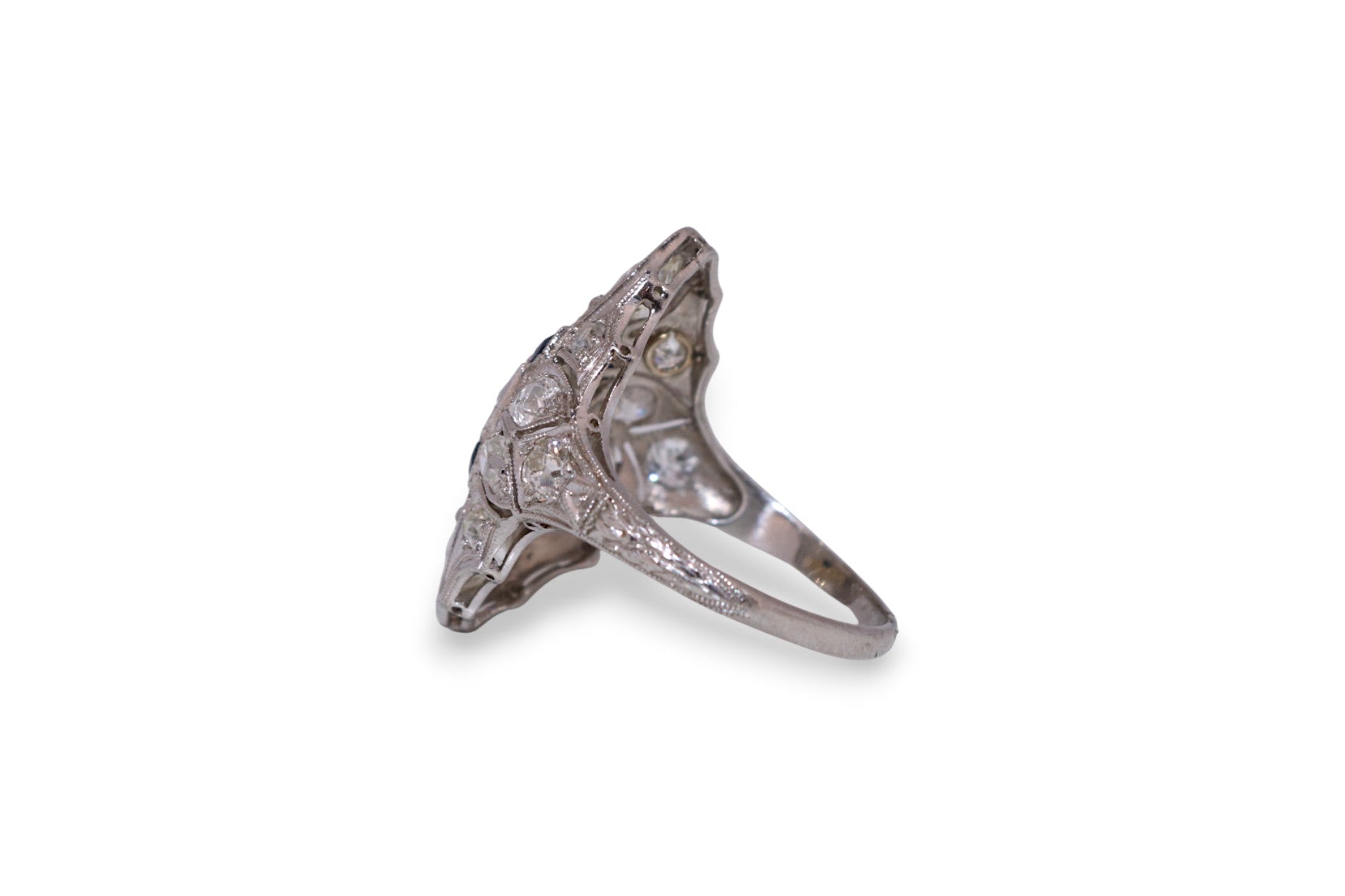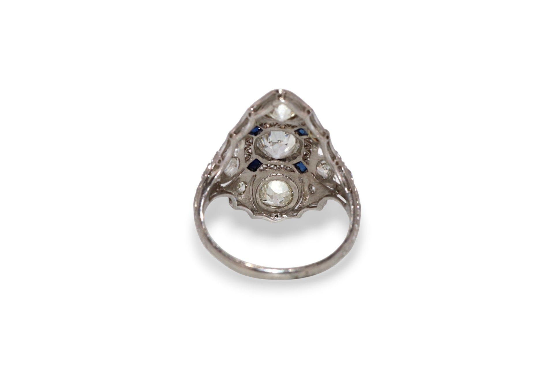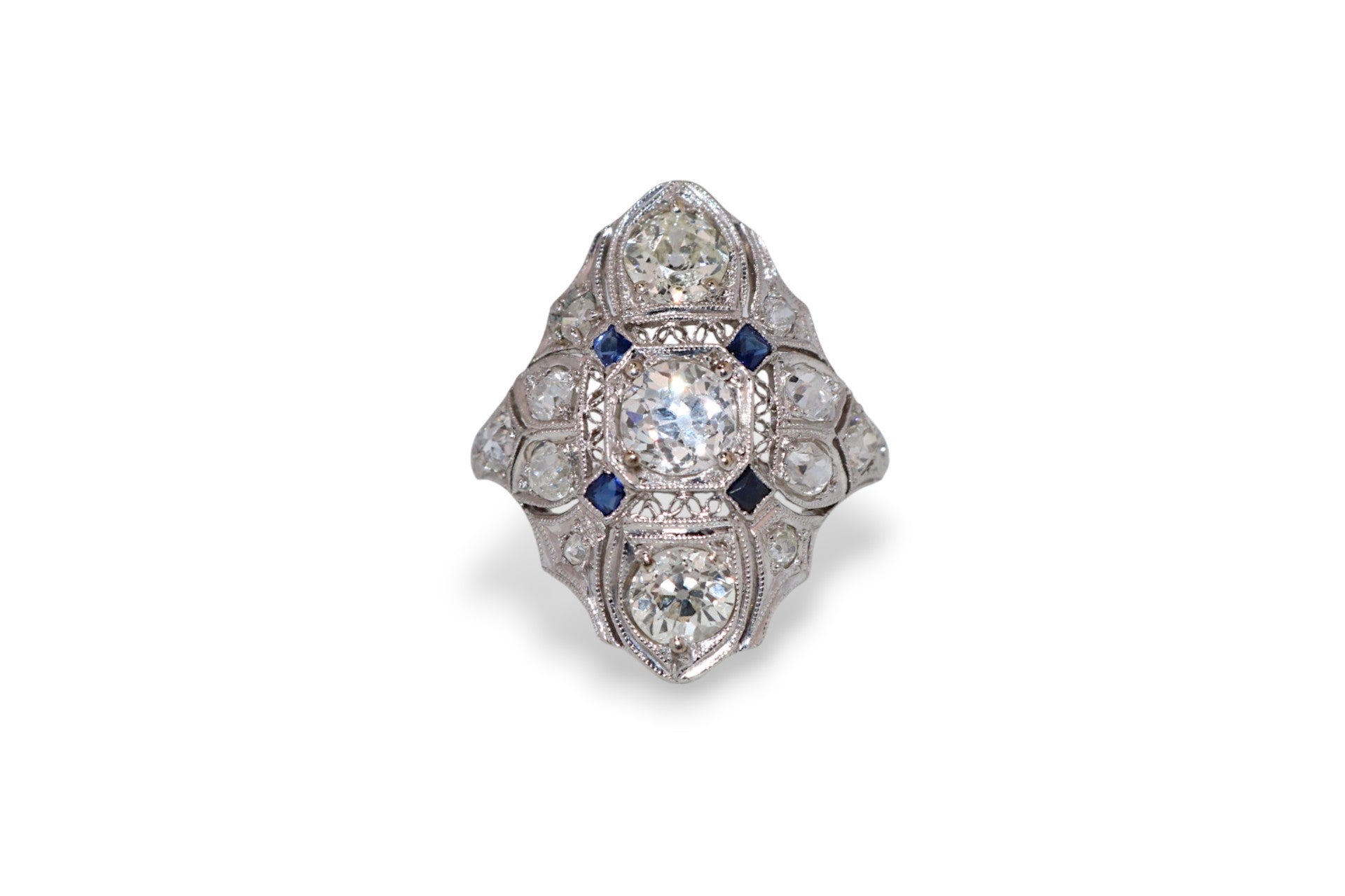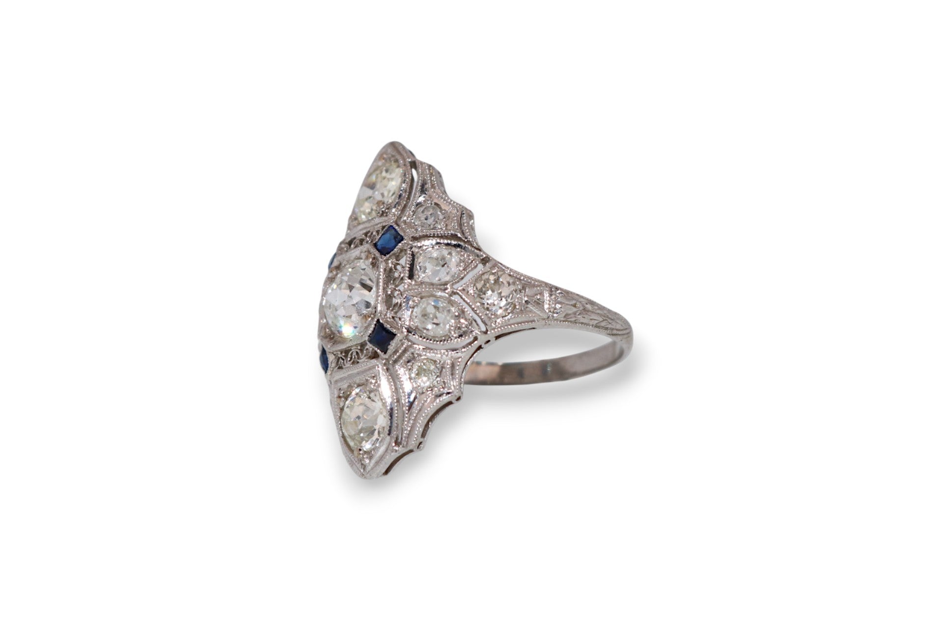 This intricate 1920’s platinum filigree ring features 1.25 carats total weight of I–J color, SI2 clarity diamonds accented by calibre-cut sapphires. The detailed openwork design and fine milgrain edges showcase the artistry of early 20th-century craftsmanship, making it a standout heirloom piece.