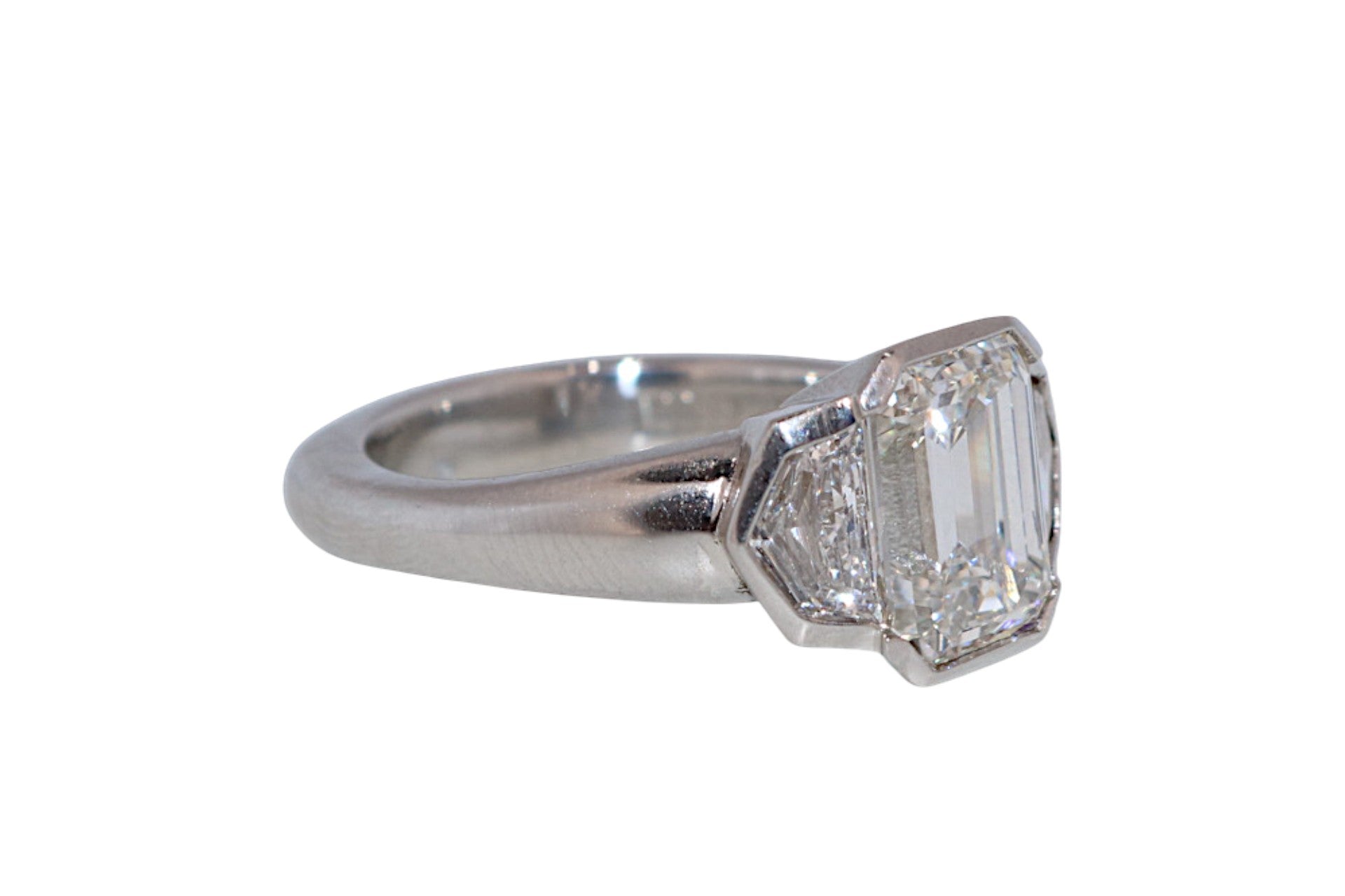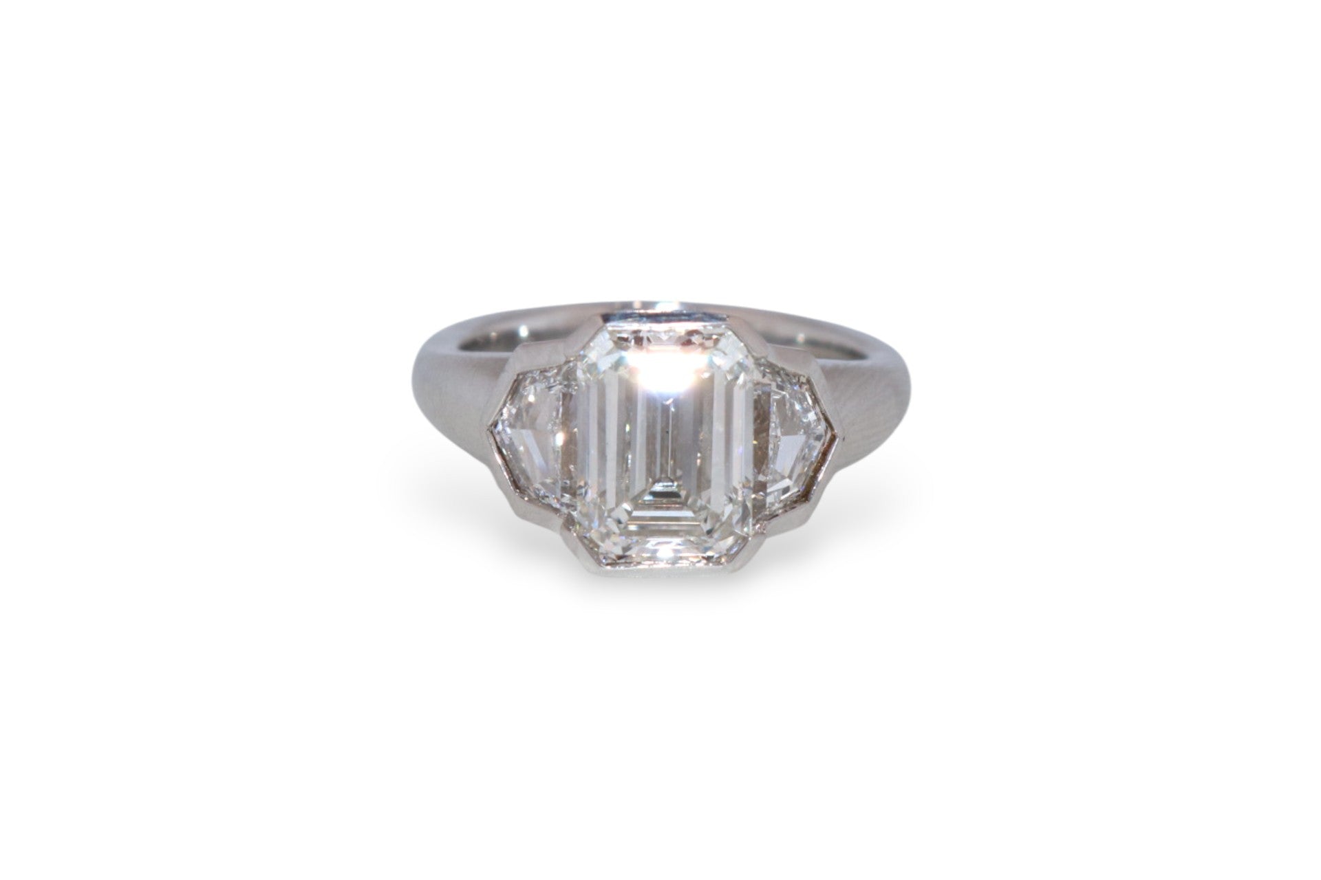 This exceptional platinum ring features a 3.06 carat emerald-cut diamond center framed by 1.01 carat total weight of Cadillac-cut side diamonds. The sleek platinum setting enhances each stone’s brilliance and symmetry, creating a timeless design that exudes sophistication and elegance.