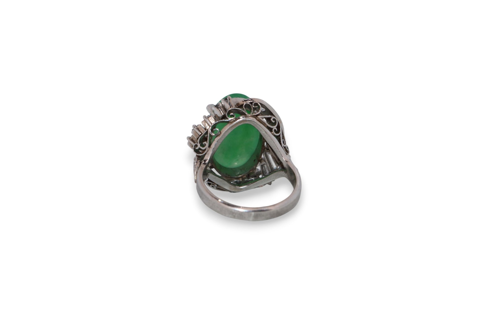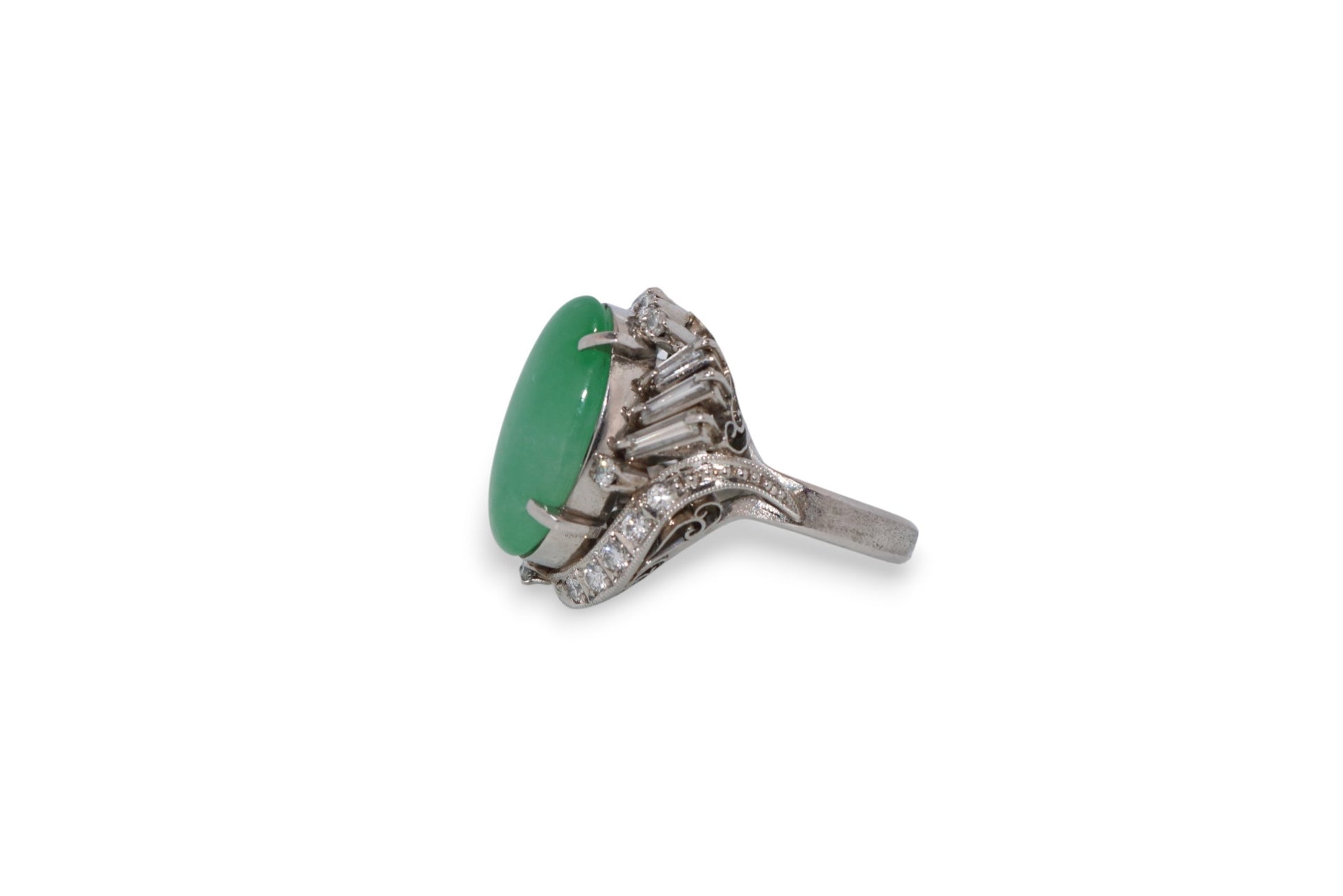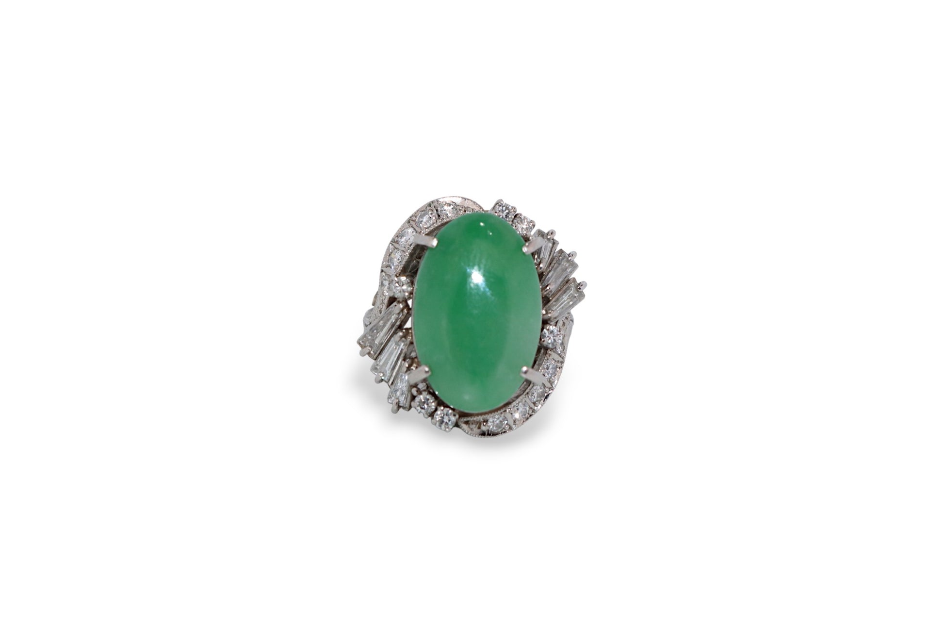 A captivating vintage platinum ring showcasing a 6.17-carat natural jade cabochon framed by 0.84 carats of brilliant diamonds graded H–I color and SI2–I1 clarity. The intricate design features a sweeping diamond-set gallery with elegant baguette and round accents, embodying mid-century craftsmanship and refined artistry.