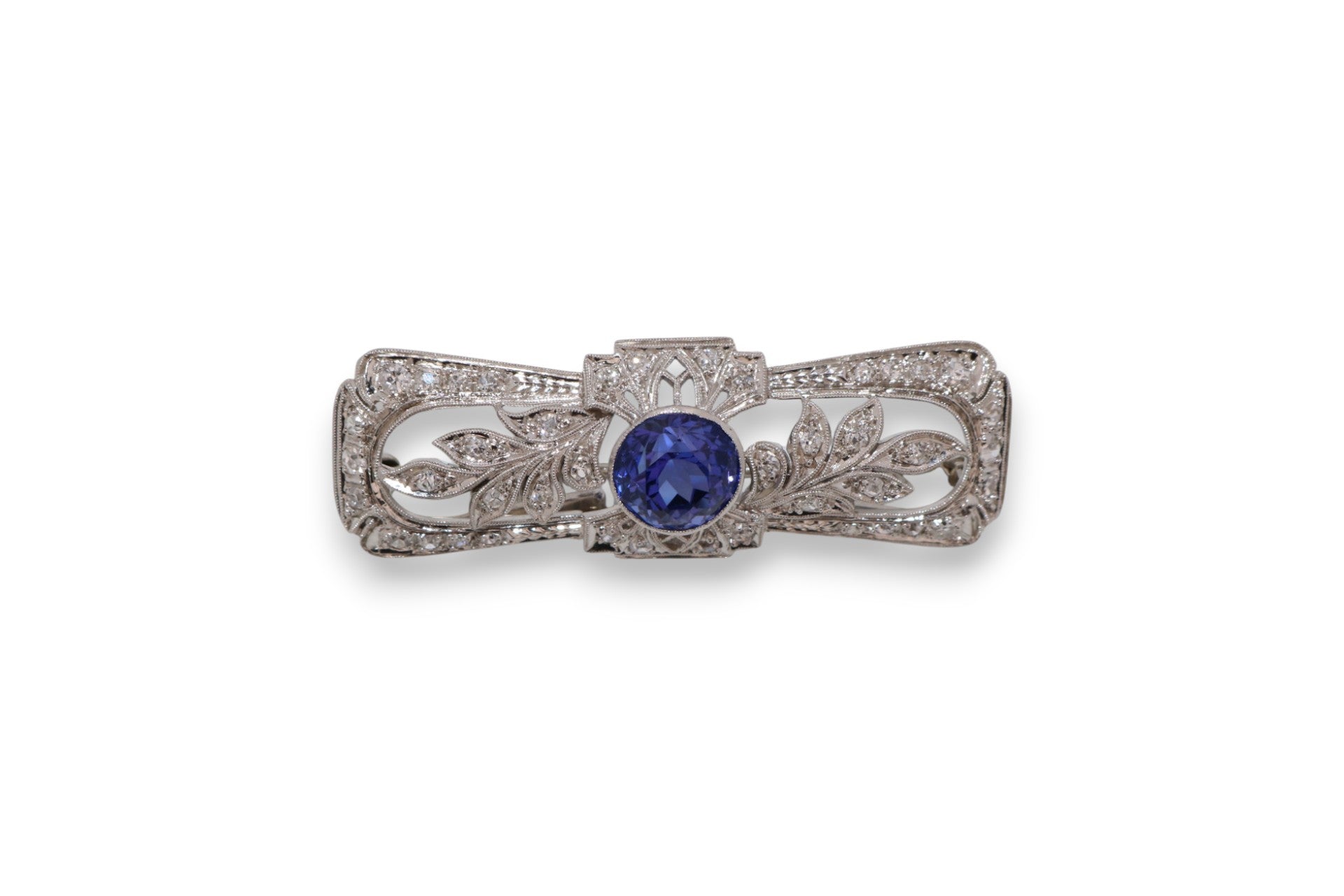 This vintage estate platinum pin pendant showcases a vivid blue tanzanite surrounded by 1.20 carats total weight of sparkling diamonds in an intricate filigree design. The detailed leaf motif and milgrain craftsmanship reflect timeless elegance and versatility — designed to be worn as both a pendant and brooch.